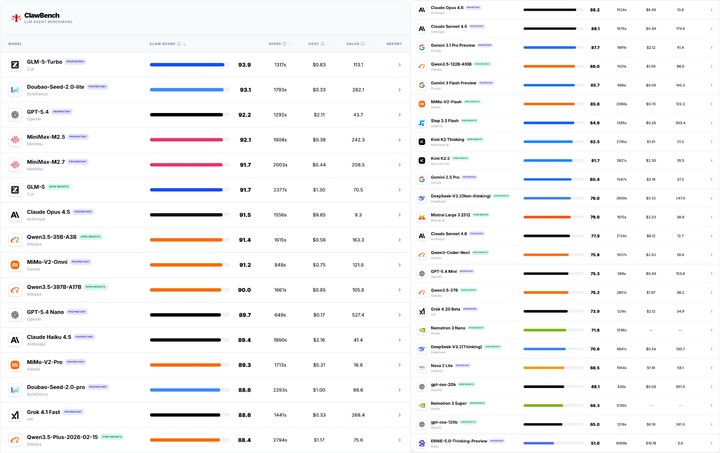 智谱 GLM-5-Turbo 以 93.9 分的 CLAW SCORE 登顶榜首,成为本次评测中综合表现最强的模型;字节跳动 Doubao-Seed-2.0-lite 以 93.1 分位居第二,其使用成本仅为 $0.33,为全榜最低;小米 MiMo-V2-Omni 以 91.2 分排名第 9,运行速度为全榜最快,仅需 848 秒完成全套任务流程。从整体榜单来看,OpenAI GPT-5.4 以 92.2 分位列第三,Claude Opus 4.5 以 91.5 分排名第七,阿里 Qwen3.5-35B-A3B 以 91.4 分位列第八。