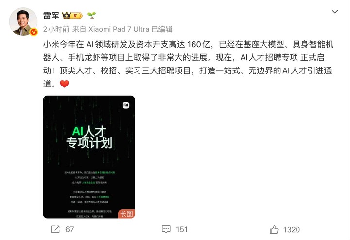 雷军表示,小米今年在 AI 领域的研发及资本开支高达 160 亿元,已在基座大模型、具身智能机器人等项目上取得重要进展。此次招聘专项设有顶尖人才、校招、实习三大通道,打造「一站式、无边界」的 AI 人才引进体系。