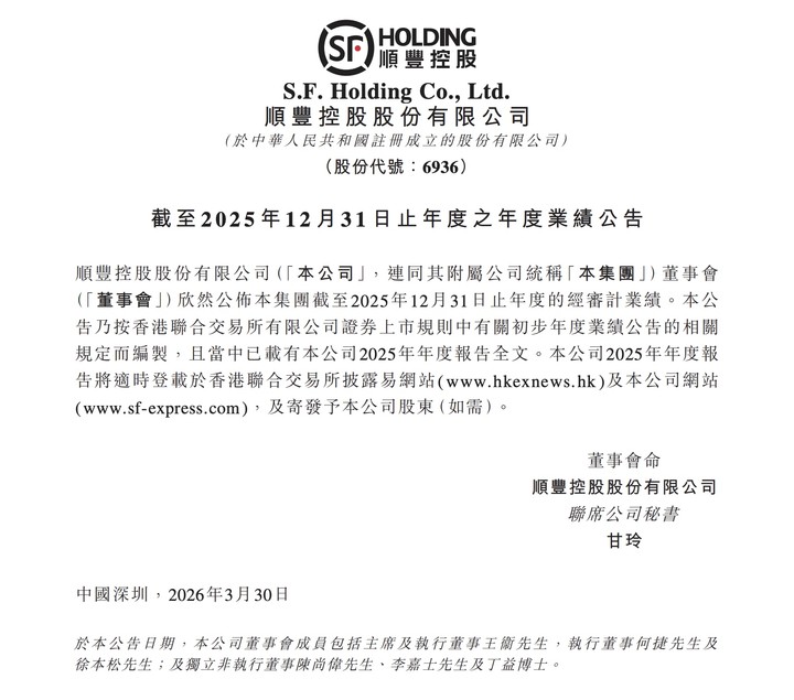 昨天,顺丰控股公布截至 2025 年 12 月 31 日止年度经审计业绩。