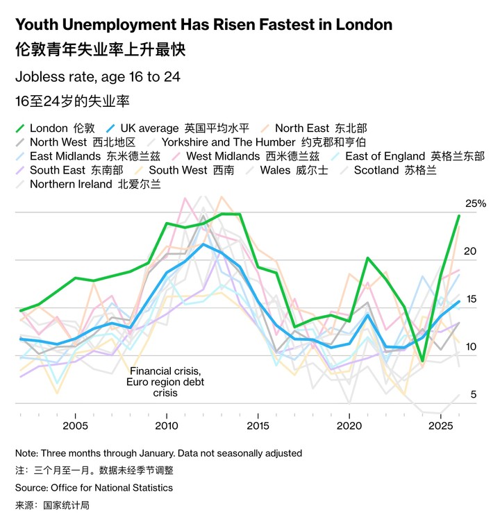 与此同时,伦敦 16 至 24 岁青年的失业率已攀升至 25%,不仅是全英国最高,也高于马德里、巴黎等欧洲主要城市同龄人的就业水平。